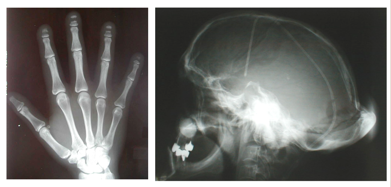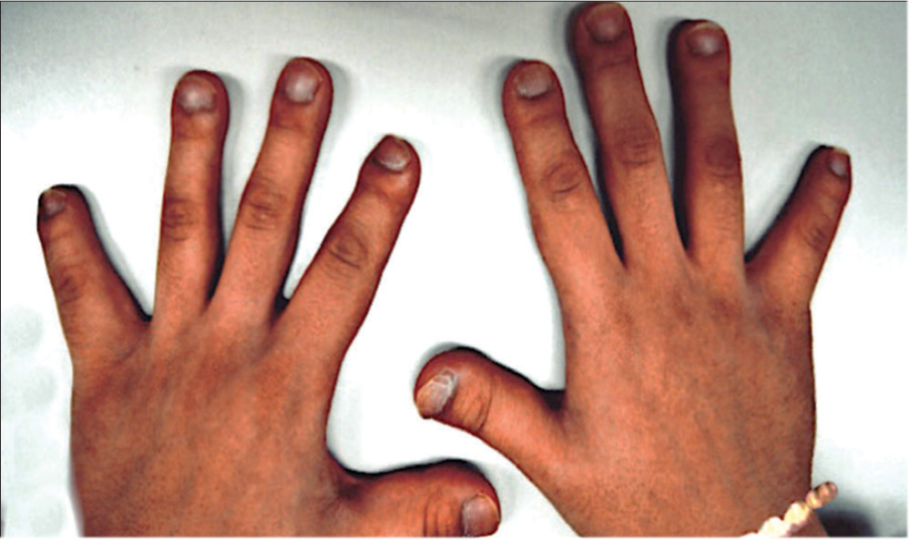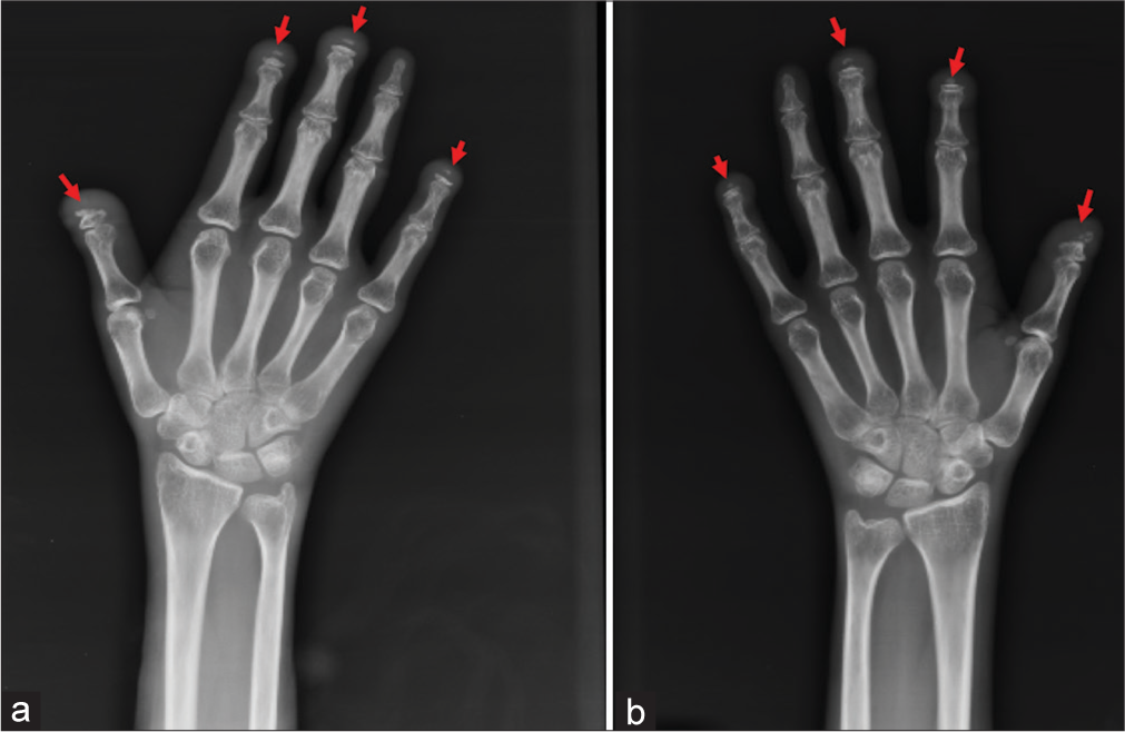 A. Skeletal Abnormalities: HCS is characterized by distinctive skeletal dysplasia. One of the hallmark features is acro-osteolysis—the progressive resorption of the distal (furthest) phalanges (finger bones) , particularly of the fingers and toes. Other skeletal features include: