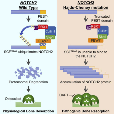 - Simultaneously, the mutation leads to overactivation of osteoclasts, cells responsible for bone resorption. Normally, Notch signaling helps regulate the balance between osteoblasts and osteoclasts, but in HCS, the disrupted signaling results in excessive bone resorption and insufficient bone formation, leading to osteoporosis and acro-osteolysis.